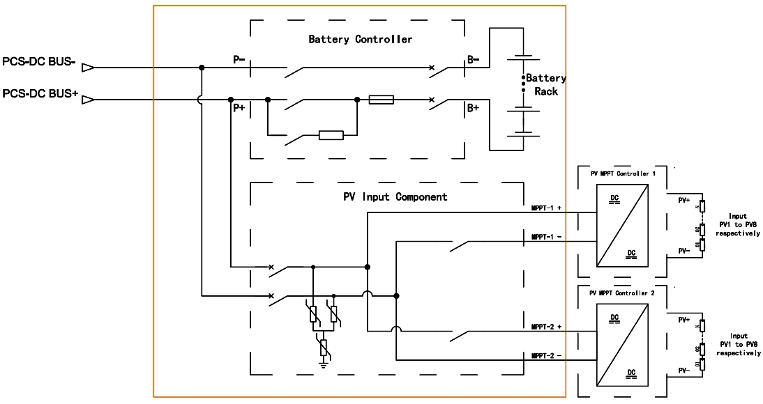 4. Sistem za shranjevanje energije baterije vključuje enoten vhodni vmesnik DC in krmilno omarico baterije za samodejno krmiljenje fotonapetostnega MPPT za zaščito polnjenja baterije.