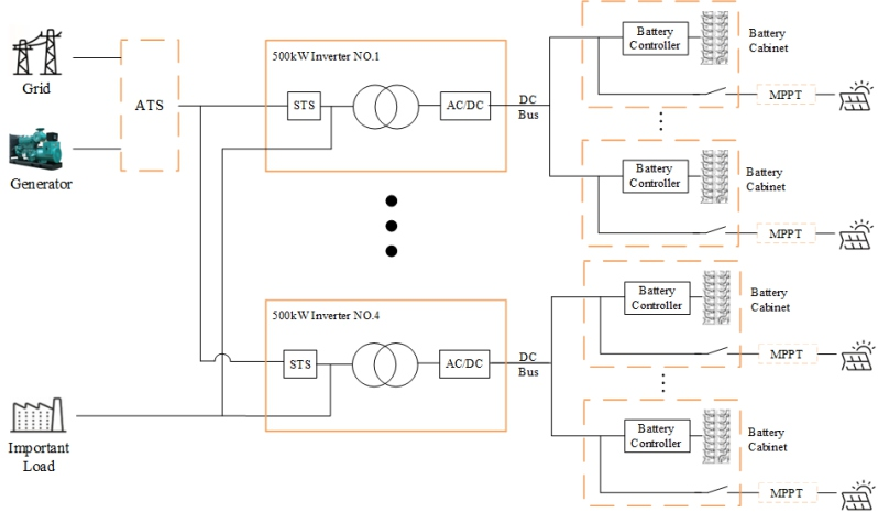 2. Pri vzporednem delovanju več 500 kW sistemov in distribuciji različnih 500 kW razsmernikov STSacross je ključno zagotoviti, da je dolžina kabla od omrežne vezne točke do obremenitvene vezne točke dosledna;