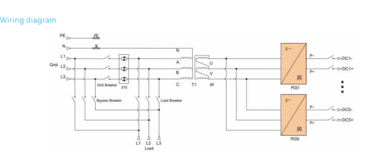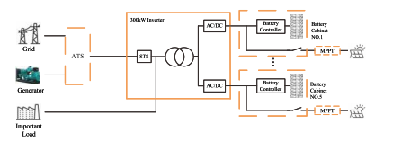 Funkcija Sistem uporablja modularne inverterske enote v vzporedni konfiguraciji, kjer DC vhod vsakega inverterskega modula ustreza namenski baterijski omarici, omogočanje upravljanja na gručo za odpravo kroženja tokov med vrvice baterij. Napajalni moduli AC/DC podpirajo prilagodljivo uvajanje tako v količini kot v nazivna moč z največjo zmogljivostjo 60kW modulov v 5-enotni vzporednici konfiguracijo. AC izhod iz napajalnih modulov se dovaja prek transformatorja izolirana izhodna stopnja, ki napaja breme z močnim uporom trenutni šok. Hibridni ESS uporablja fotonapetostno integracijo, povezano z enosmernim tokom, ki dosega visoko učinkovitost pretvorbe energije in optimizirana za scenarije izven omrežja s PV proizvodna zmogljivost presega povpraševanje po obremenitvi; Krmilniki MPPT za uporabo na prostem integrirajte funkcije združevalnika in MPPT v eno samo utrjeno ohišje. Celoten sistem vključuje možnost dizelskega generatorja ATS, 300kW hibrida pretvornik, krmilnik PV MPPT in sistem za shranjevanje energije v baterijah.